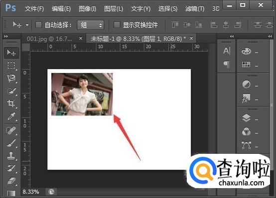 把相片放到工作区的左上方,如图所示位置,再按住Ctrl+Alt键不放,按住相片往右拉到如图所示位置放手,就可以复制出第二张。