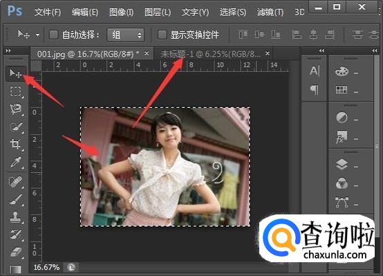 按Ctrl+A全选相片,鼠标按住不放拉到新建的文档标签上不放手,直到显示新建文档工作区后,拉动到工作区上再放手,如图。