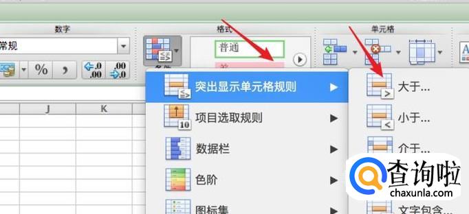 在弹出的菜单里,选择‘突出显示’-->‘大于’