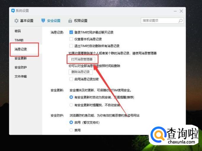 切换之后,在“消息记录”位置找到“打开消息管理器”,如图所示。