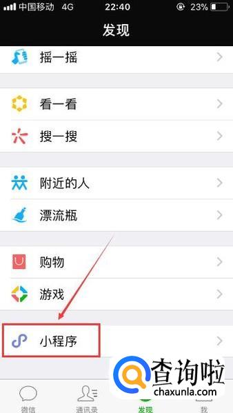之后再点击【发现】页面底部的【小程序】功能。
