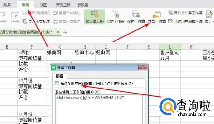 然后我们回到刚才打开的表格,在顶部点击“审阅”然后找到“共享工作簿”会弹出窗口,我们在“允许多用户同时编辑,同时允许工作簿合并”前面勾选后点击确定就可以解决了。