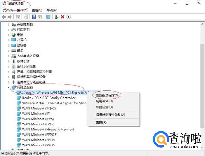 鼠标右击"11b/g/n Wireless LAN Mini-PCI Express Adapter Ⅱ"项,弹出快捷菜单选择"更新驱动程序"图标。
