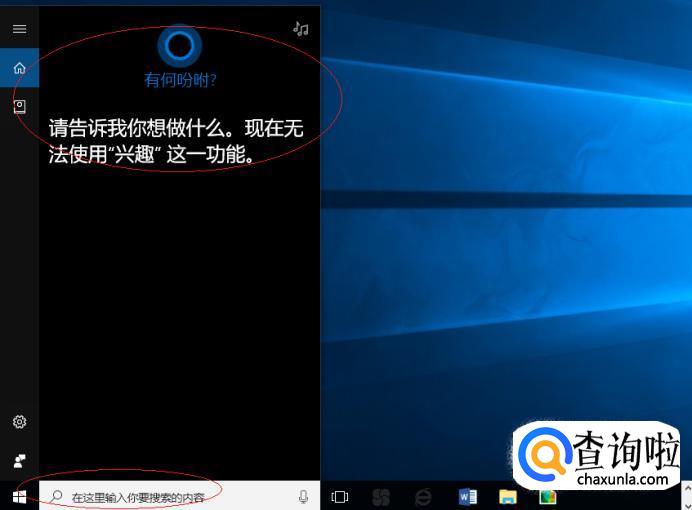 点击任务栏搜索框,使用Cortana(小娜)智能语音助理。