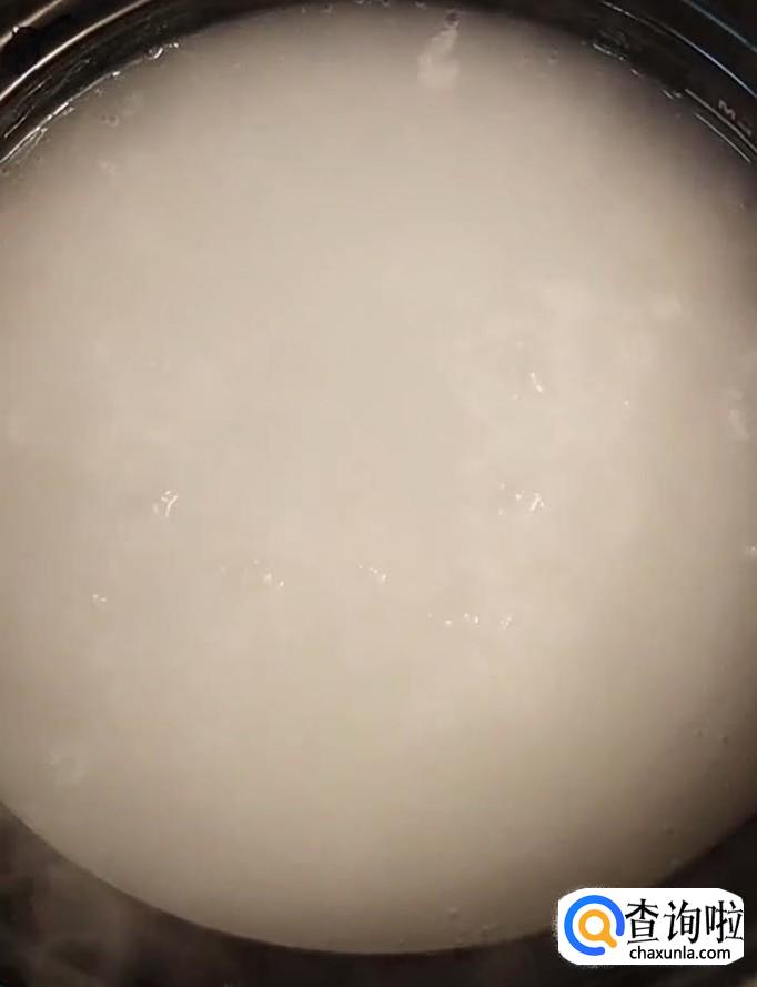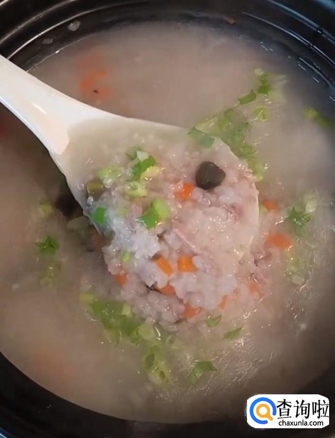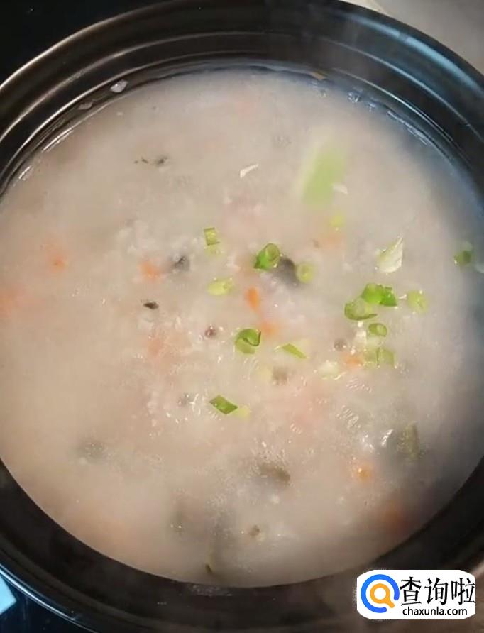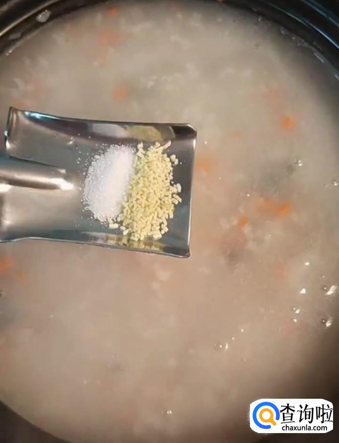 然后把腌制好的猪肉倒入熬好的粥内,放入一些胡萝卜丁,皮蛋丁,适量的盐,鸡精,继续熬至5分钟关火