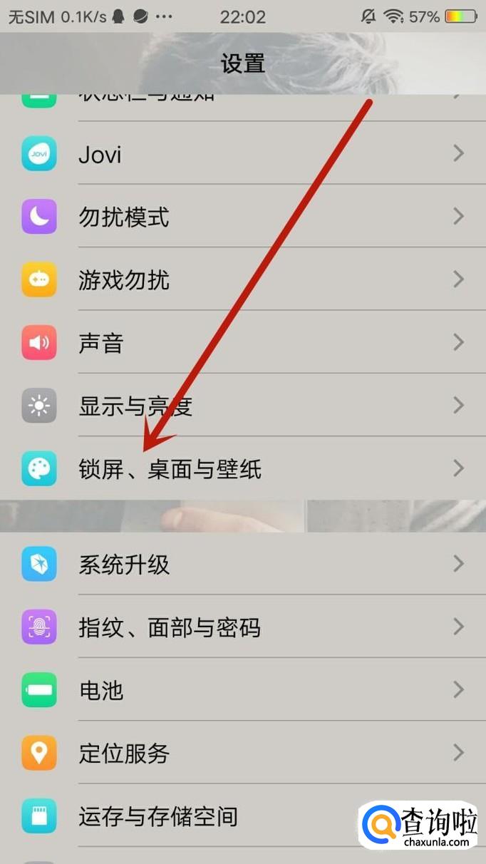 在手机“设置”页面找到“锁屏、桌面与壁纸”,如图所示。