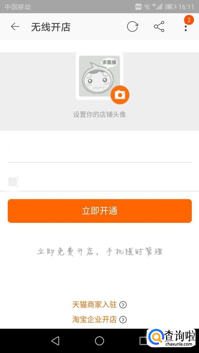 进入“我要开店”后,上传头像,输入店铺名称及店铺介绍,点击“立即开通”。