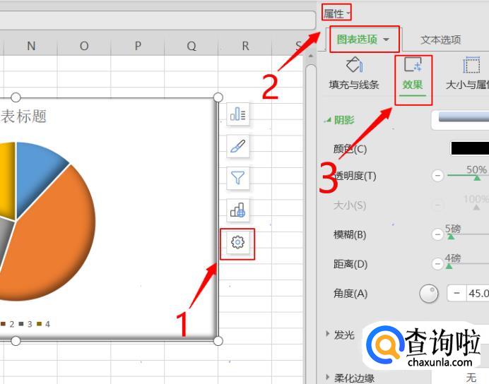 使用三维图然饼状图更有立体感。选择需要的立体部分,点击设置后,在“图表选项”中的“效果”里,就可以进行效果设置,增加立体感。