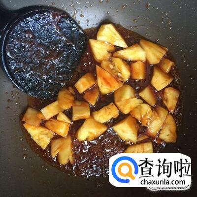然后把菠萝去皮切成丁,倒入锅中翻炒两分钟。