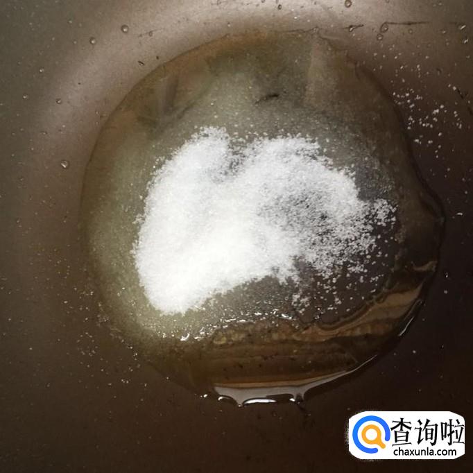 然后将底油加热至冒烟,倒入适量白砂糖,熬成金黄色。