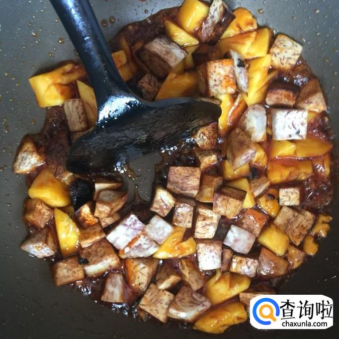接着把刚才炸好的香芋倒入锅中,翻炒三分钟就可以出锅了。