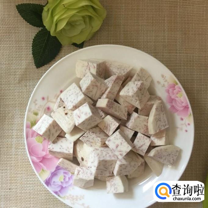 然后把香芋去皮切成丁,如下图所示。