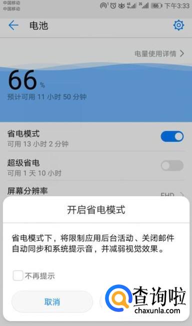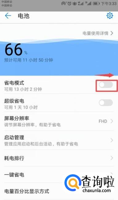 弹出的界面,我们将省电模式的开关向右滑动;