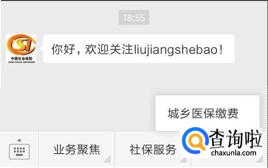 在微信上关注“柳江社保”公众号,然后点击右下角的“社保缴费”,在弹出的菜单上点“城乡医保缴费”。 - 02