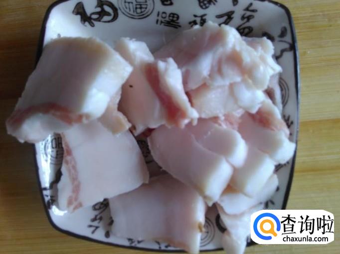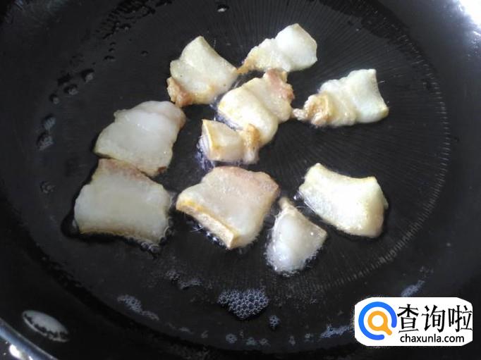 开火,下少量的油,【要下点油才可以炸出肥肉里面的油出来】把半瘦肥肉放进去煎到焦黄色,炸出油来。
