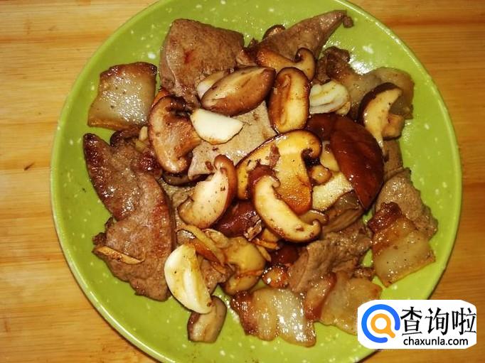 羊肝150克,香菇100克,半瘦肥肉100克,姜丝、蒜米适量。