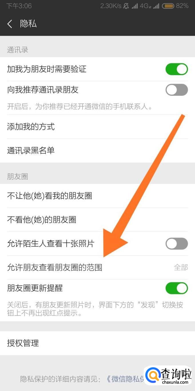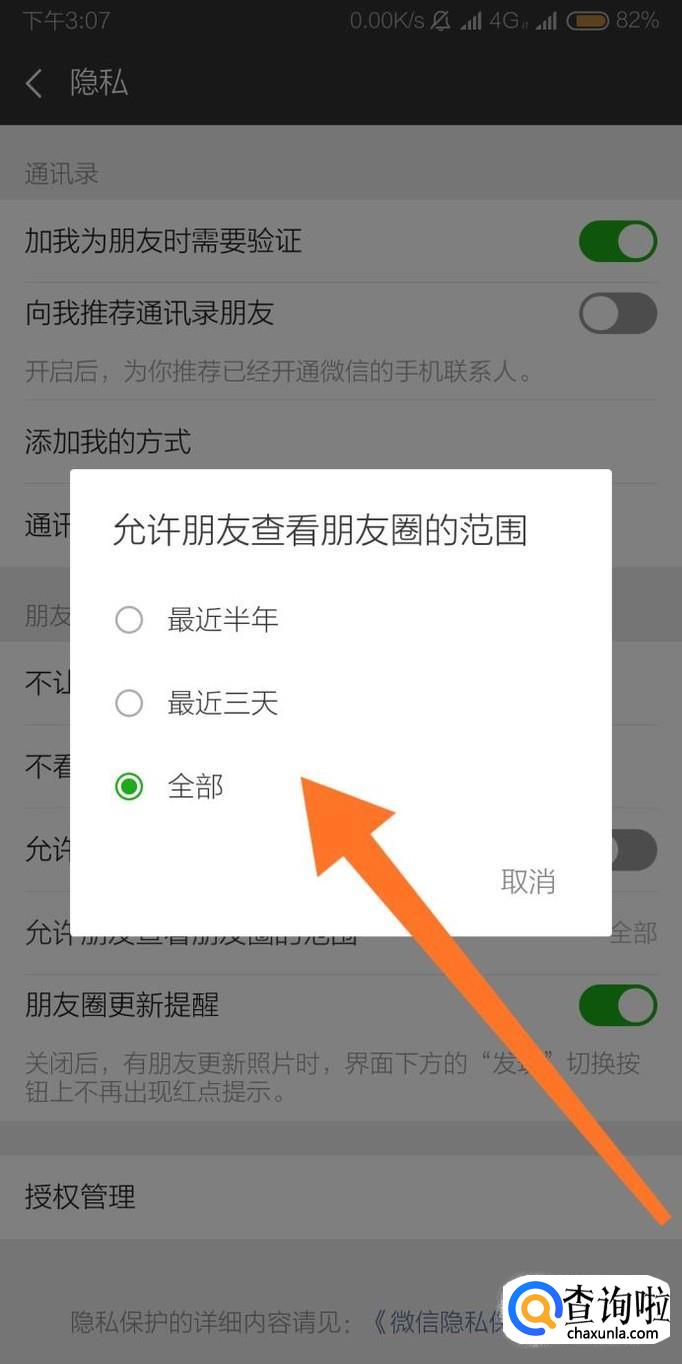 接下来可以点击“允许朋友查看朋友圈的范围”设置选项,设置朋友可以查看到我们朋友圈某一时间范围内的动态。