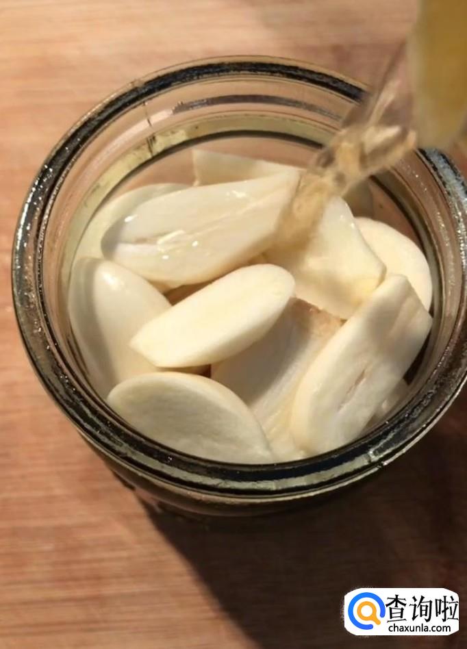 然后我们准备一个无油无水的玻璃罐子,将切好的蒜放进去,加入适量的米醋与白糖,摇晃一下
