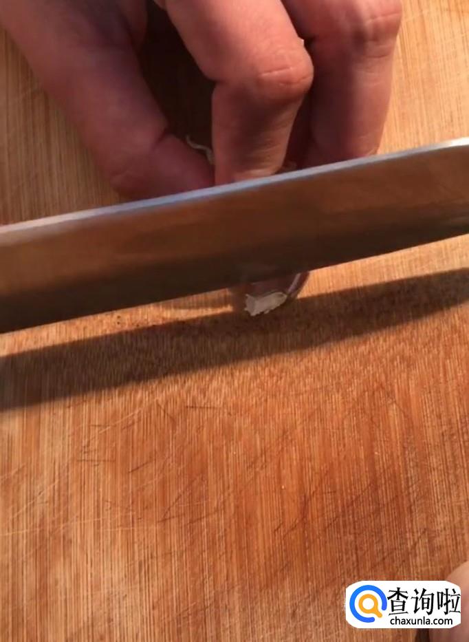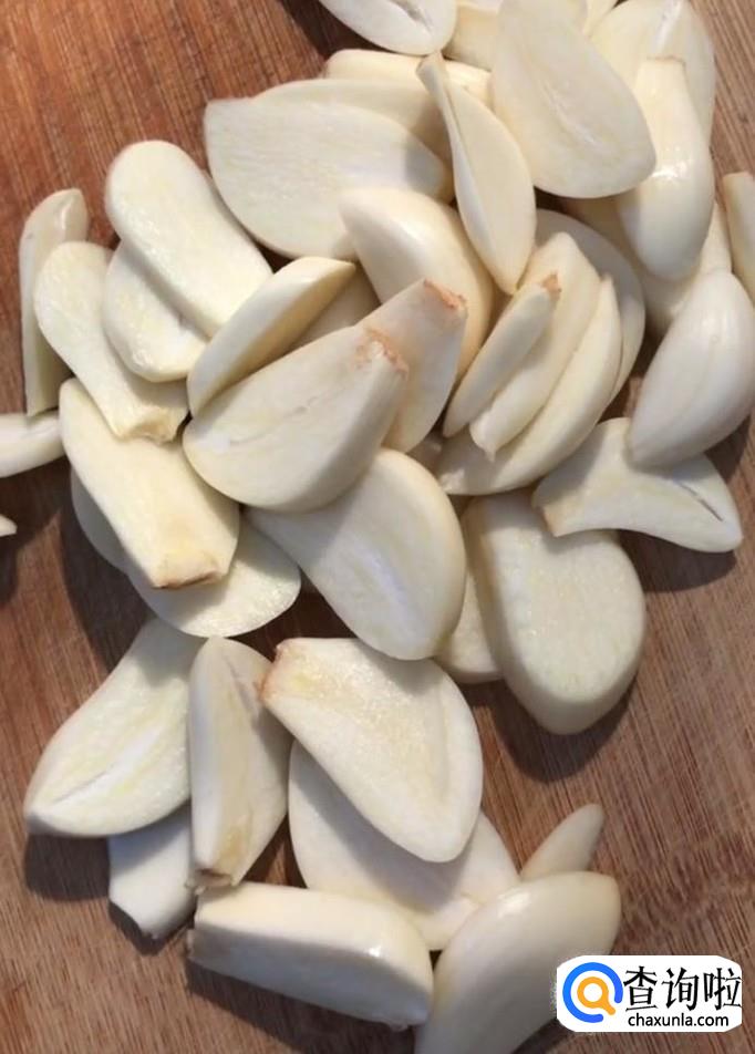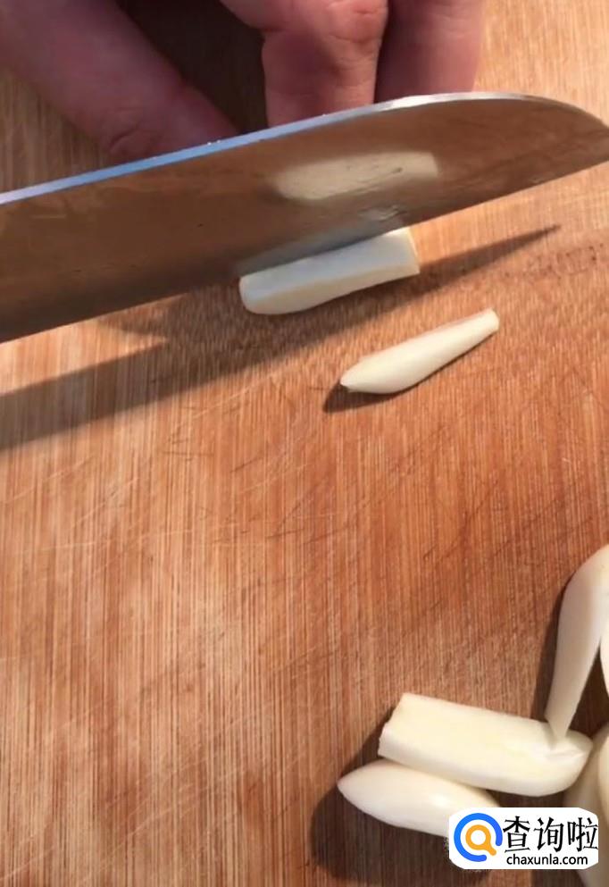 然后我们用到把它切成片,大约一个蒜瓣切两刀即可,如图所示