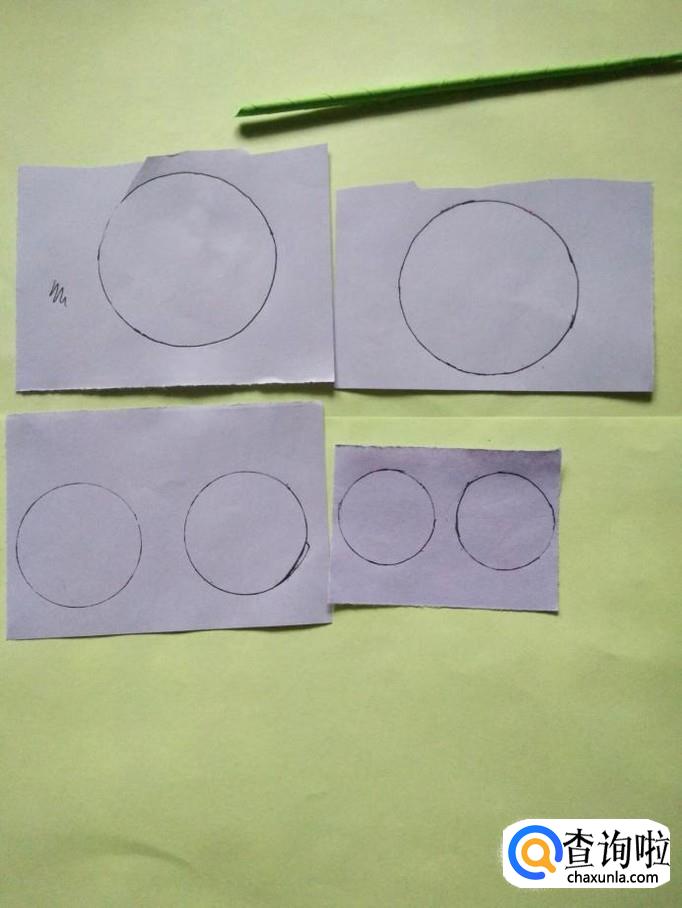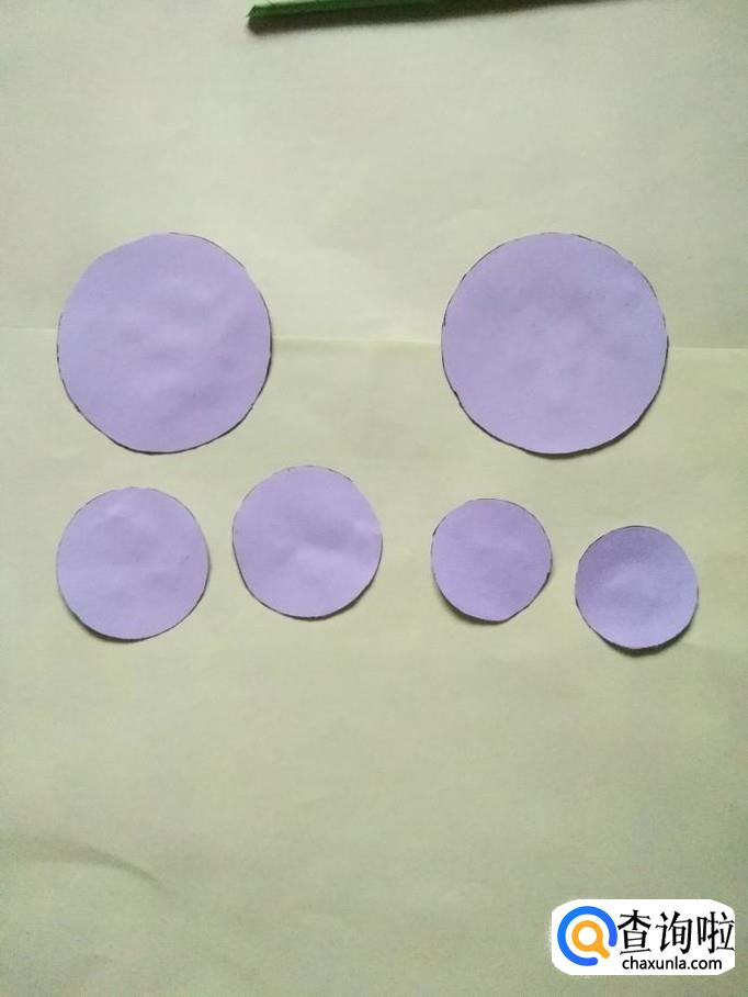 下面我们来制作花朵。首先选几张大小不一的长方形彩纸或是一张较大的彩纸(颜色可选自己喜欢的),在彩纸上面用圆规画好大小逐渐变小的三组圆,每一组的两个圆一样大,如图