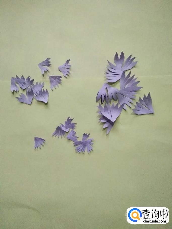 下面就按照这样的方法,把这些四分之一的花瓣按由小到大的顺序一层一层的全部粘贴在枝干上,如图