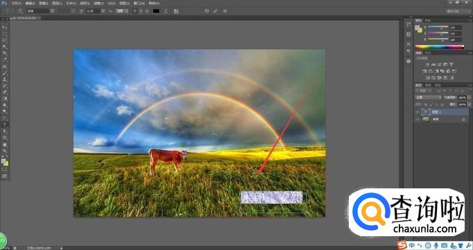 确认打开图片后,被选中图片便会出现在PS界面上,此时我们选择“文字工具T”,并在图片上的合适区域划出一个文本框(鼠标左键按住不放在图片上拖动)用以添加文本。