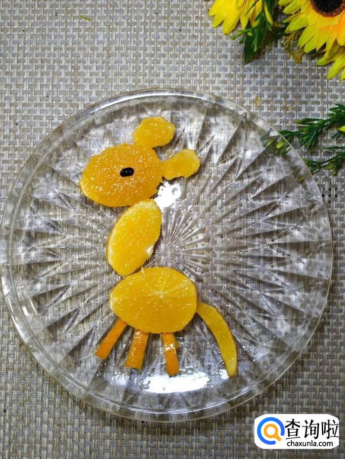 再用多余出来的橙子皮,做出长颈鹿的耳朵,再做出长颈鹿的腿部和尾巴。
