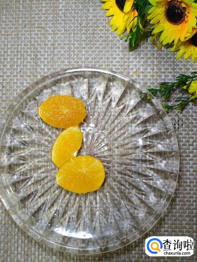 将橙子纵向切开,取左右两边带皮的部分,做成如图所示的形状,放入盘里,这是长颈鹿的头部,脖子和身体。