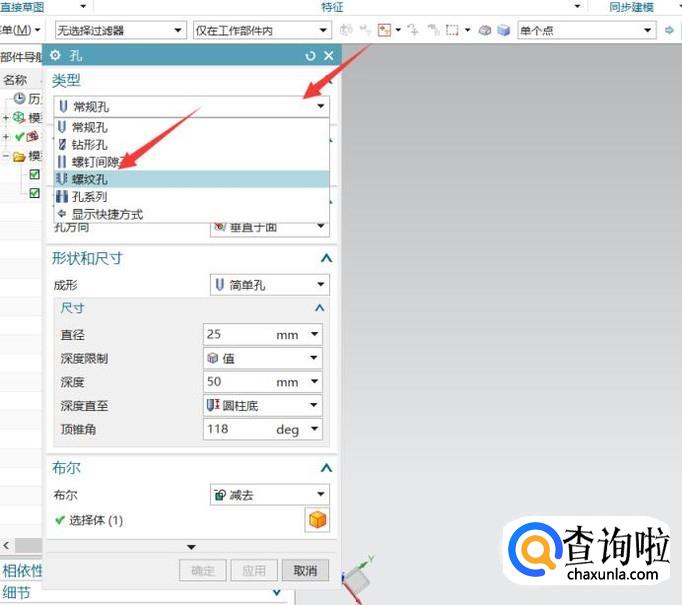 然后在点击常规孔这里的下拉条找到螺纹孔。