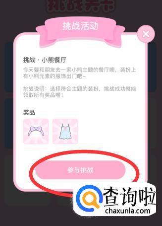 在文字说明部分可以看到本关强调的元素是小熊,所以,要穿戴含有小熊元素的服饰。点击“参与挑战”进入关卡。