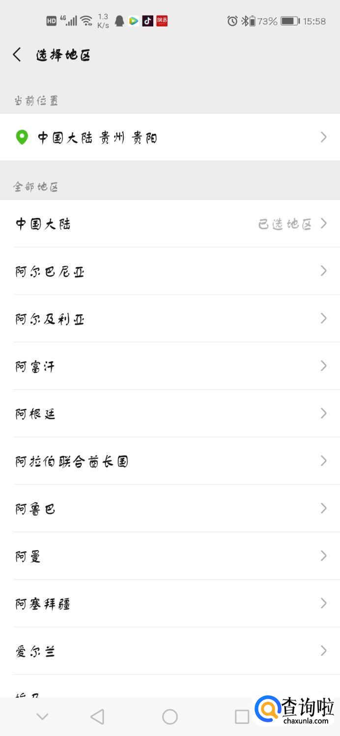 进入界面,直接点击“地区”,进入界面开始设置我们的地区,然后就点击这个中国选项,进行下一步的细致划分,选择我们相应的省份和地区。