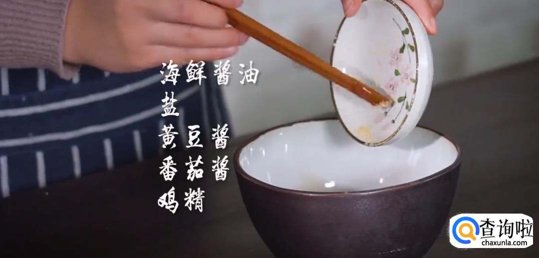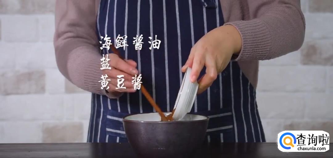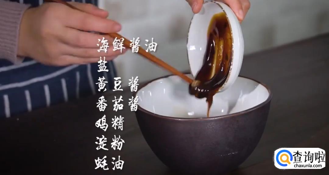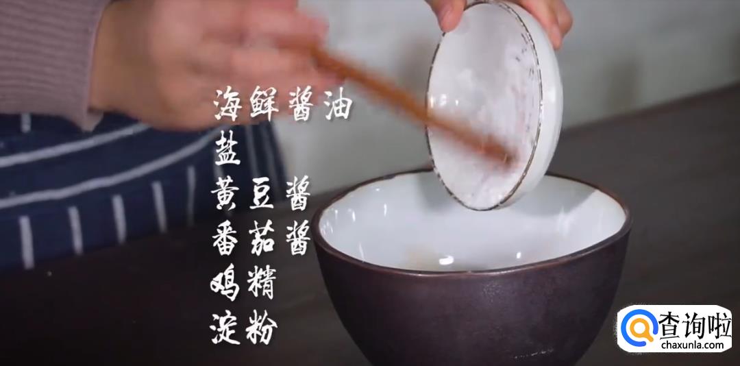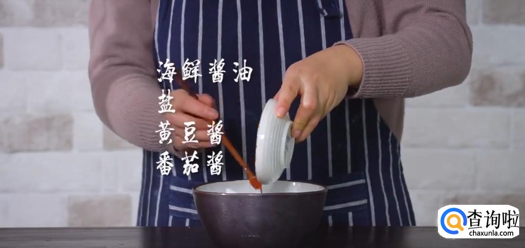 准备酱汁,将海鲜酱油,黄豆酱,盐,鸡精,淀粉,蚝油,番茄酱搅拌均匀。