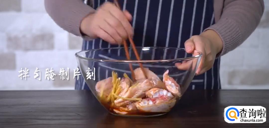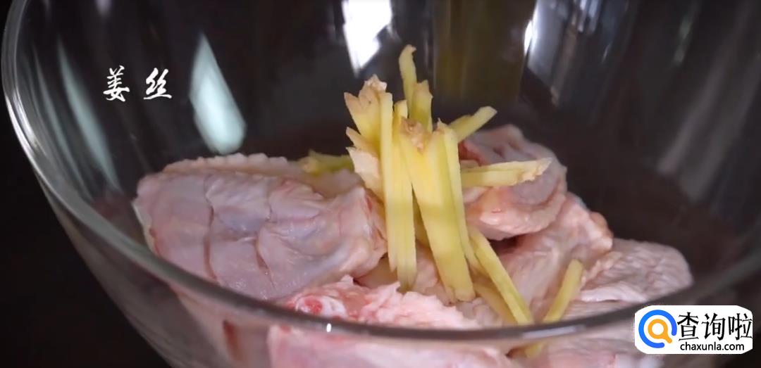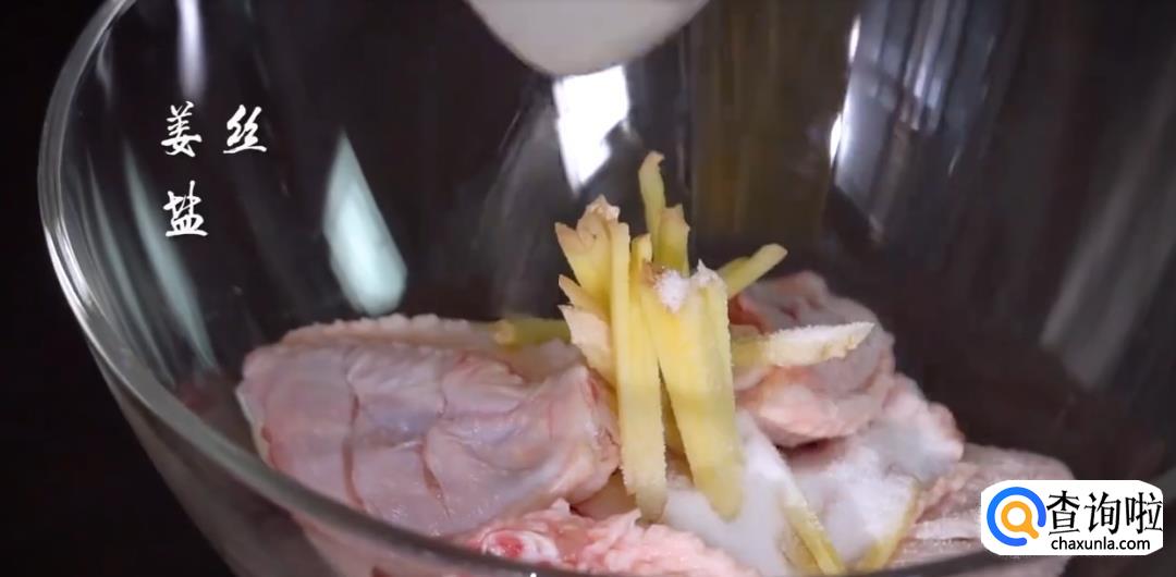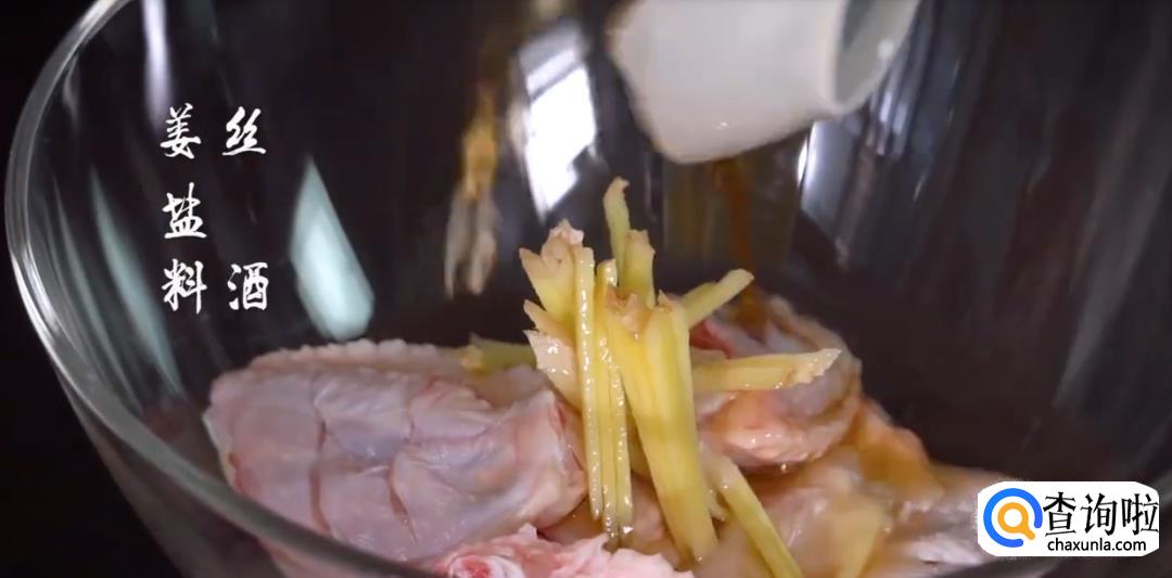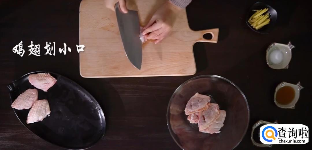 将鸡中翅切小口,放入姜丝,盐巴,料酒搅拌均匀后腌制片刻。