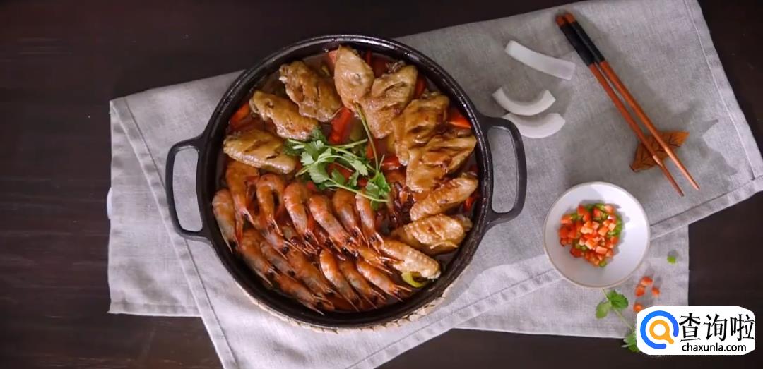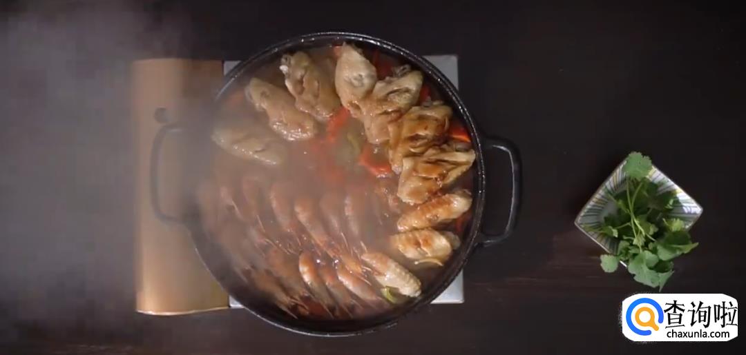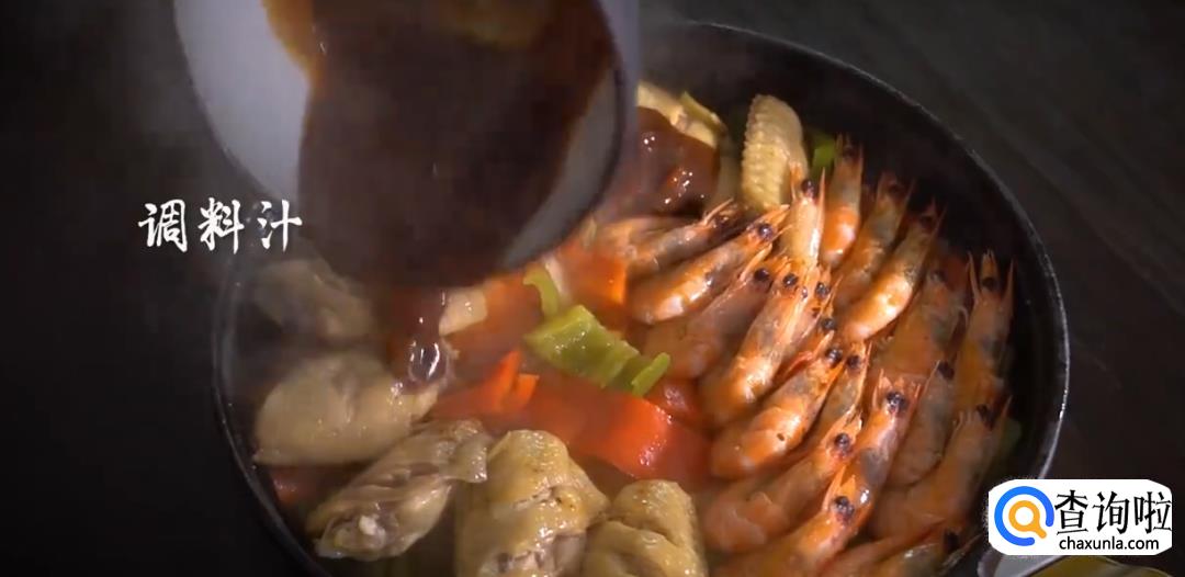 将调料汁均匀地铺在鸡翅和基围虾表面,再盖上盖子焖煮10分钟即可开盖。