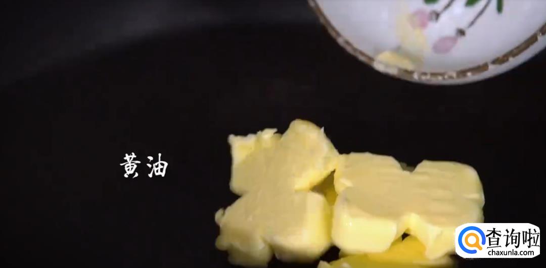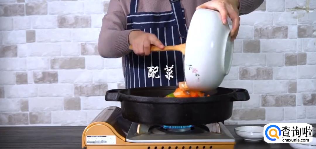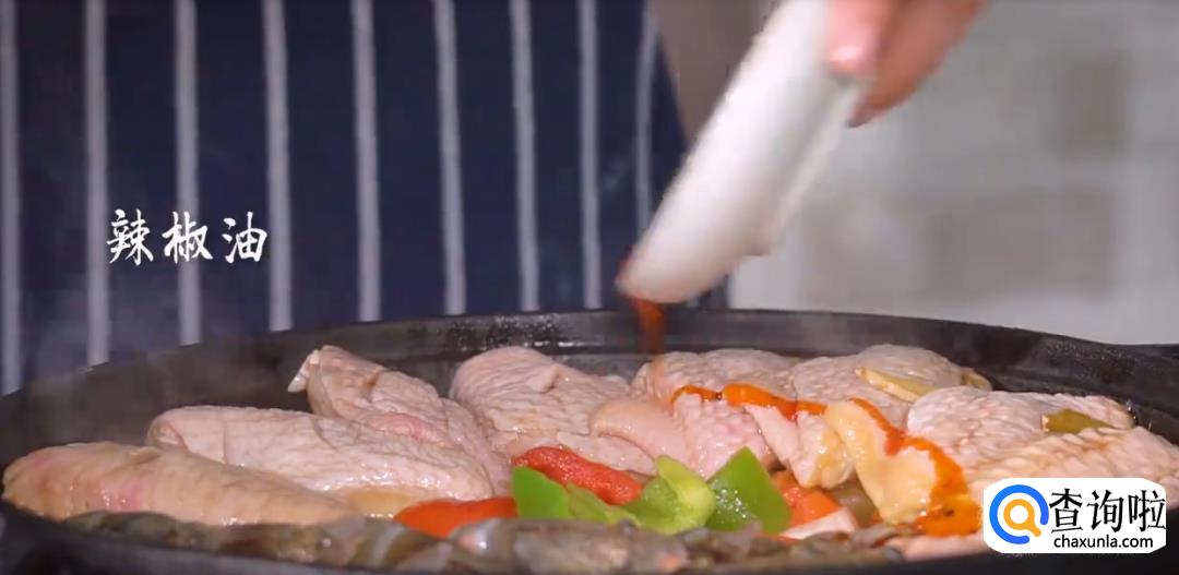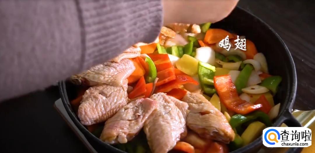热锅下黄油,锅底倒入配菜,将鸡翅和基围虾摆在表面。