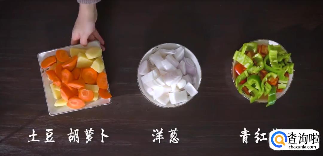 准备好胡萝卜块,土豆块,青红椒块和洋葱块。