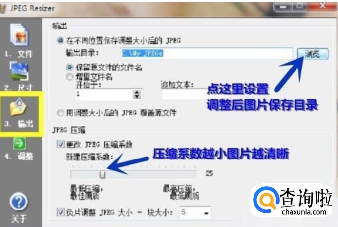 下载完成之后,双击JPEG Resizer.exe运行软件。首先进行输出设置,点击左边菜单栏中的“3.输出”,在右边窗口中可以设置调整后的图片文件输出路径,单击“浏览”,选择想要保存图片的文件夹,确定即可。也可以选择调整后覆盖源文件。这里还可以调整JPEG压缩系数,这里一般设置为1调整出来的图片最清晰。
