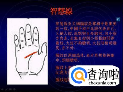 智慧线又叫做“人纹”。从大拇指和食指中间出发,往“月丘”延伸的线,影响的是个性、思路方面。