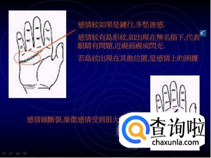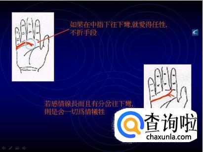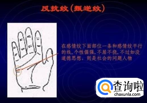反抗纹,在感情纹下面部位一条和感情纹平等的线,个性倔强,不屈不挠,不过如没道德思想,则是社会的问题人物。