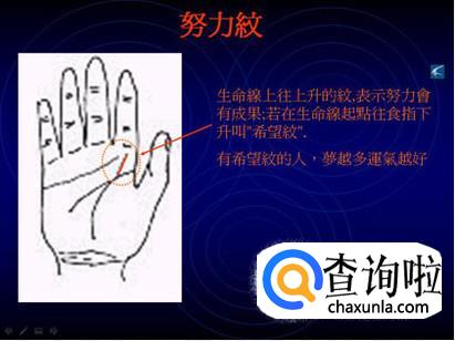 努力纹,在生命线中也称“希望纹”,表示一个人生命的希望有多少。