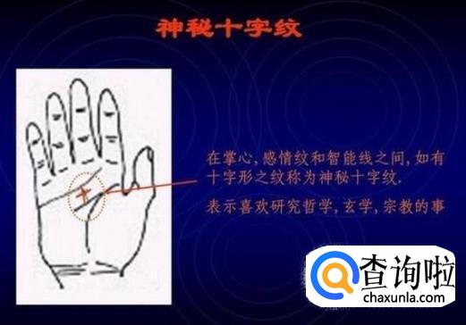 神秘十字纹,在掌心,感情纹和智能线之间,如有十字形之纹称为神秘十字纹,表示喜欢研究哲学、玄学、宗教的事 。