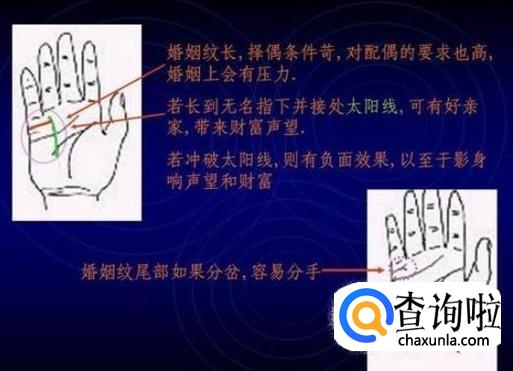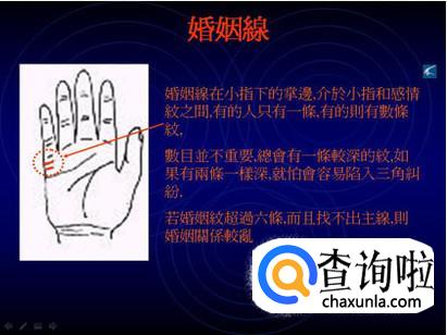 婚姻线又叫做“结婚线”。出现在小指根部和感情线中间地带的短线,影响的是爱情恋爱方面、结婚时间等。