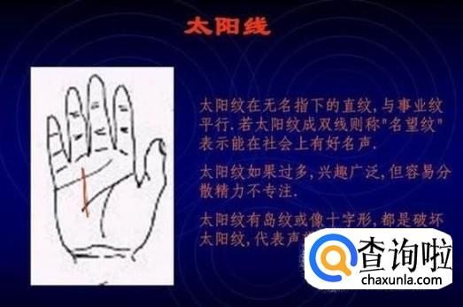 太阳纹在无名指下的直纹,与事业纹平行。若太阳纹成双线则称“名望纹”表现能在社会上有好名声。太阳纹如果过多,兴趣广泛,但容易疏散精神不专注。太阳纹有岛纹或像十字形,都是损坏太阳纹,代表声望或金钱的丧失。