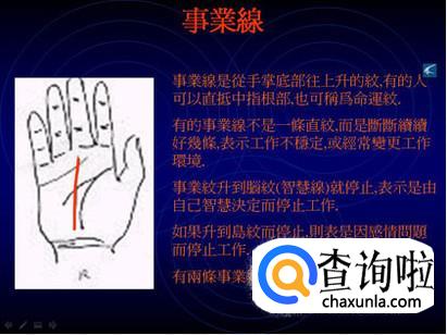 命运线又叫做“事业线”。从手腕附近朝中指上升的线,影响的是一生运势与事业方面。