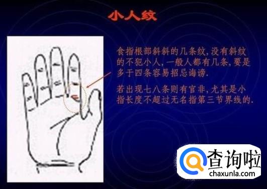 小人纹,食指根部斜斜的几条纹,没有斜纹的不犯小人,一般人都有几条,要是多于四条容易招忌诽谤,若出现七八条则有官非,尤其是小指长度不超过无名指第三节界线的。