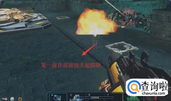 首先第一波怪物来的时候在前面放天起陷阱即可,如下图所示
