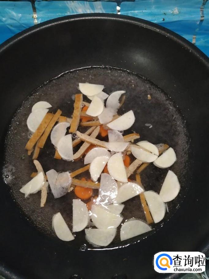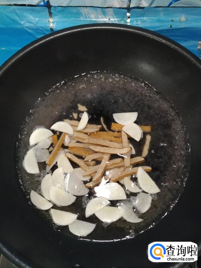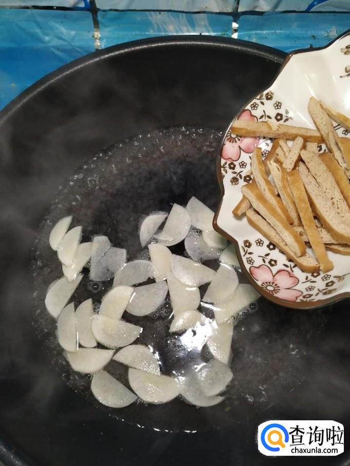 锅中放入适量清水,将切好的茭白片放入锅中,再将切好的豆干儿条也放入锅中。