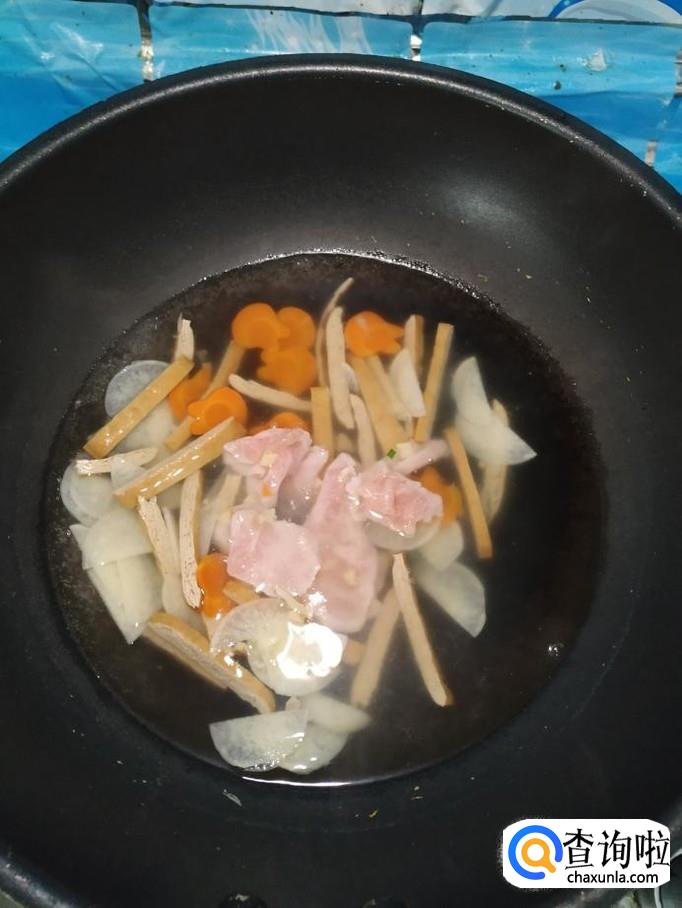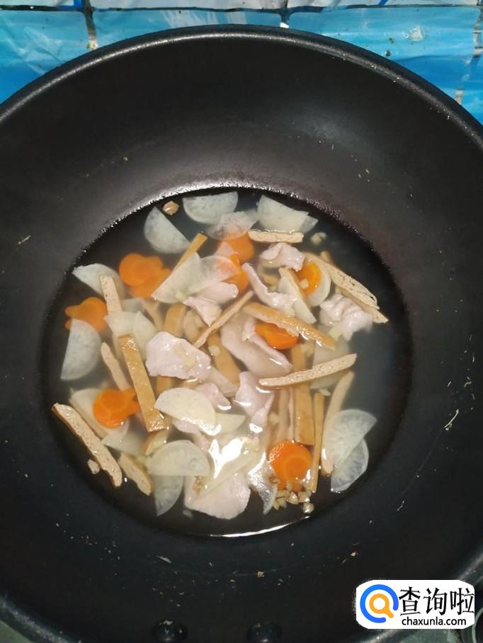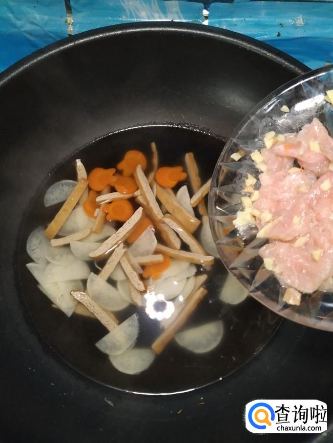 然后将腌好的里脊肉片倒入锅中煮一下。