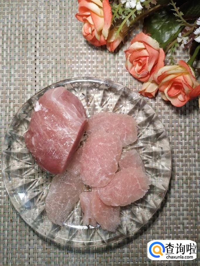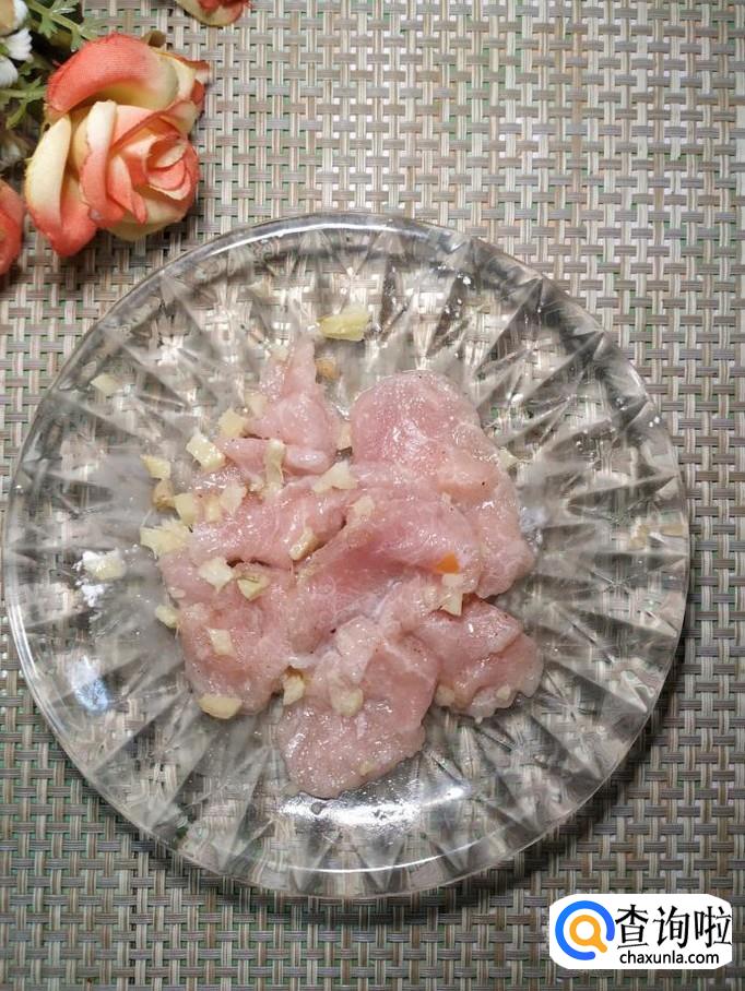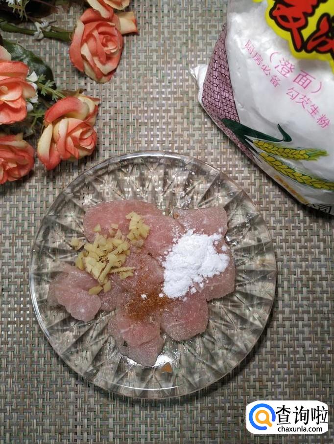 准备适量里脊肉,用清水洗净,放入冰箱冷冻一会儿,然后用刀切成很薄的片,加入适量姜末,盐,鸡精,五香粉,淀粉,搅拌均匀,腌制15分钟。