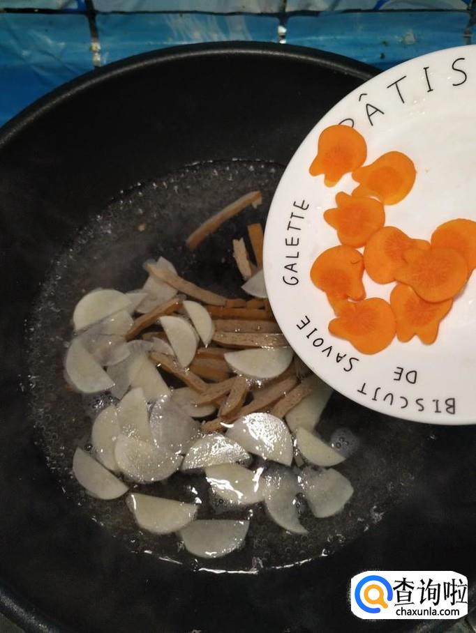 茭白适量,豆干适量,里脊肉适量,胡萝卜适量,姜适量,盐适量,鸡精适量,料酒适量,淀粉适量。